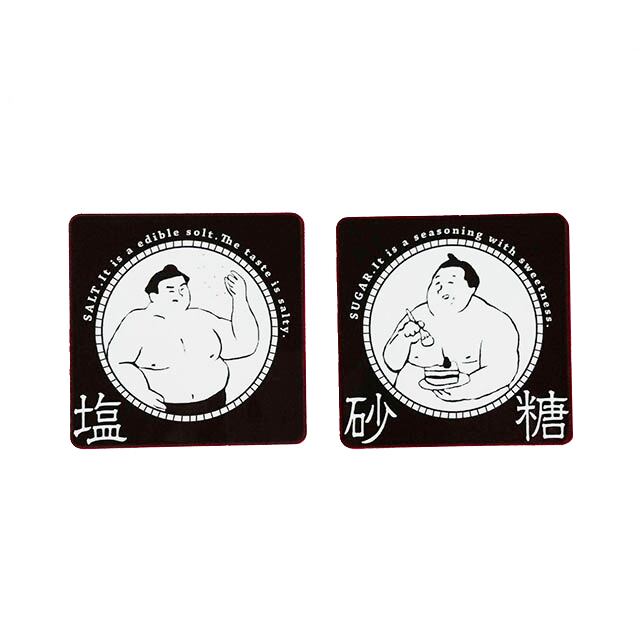 おすもうさんの姿が描かれた調味料のラベルシールステッカーです。