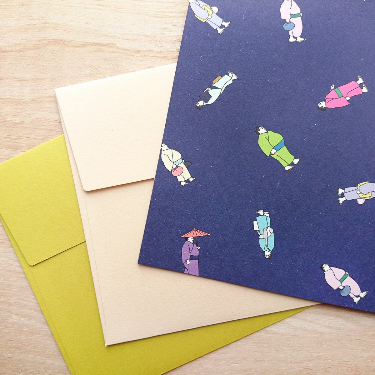 お相撲さんの着物姿をモチーフにしたカラフルなレターセットです。