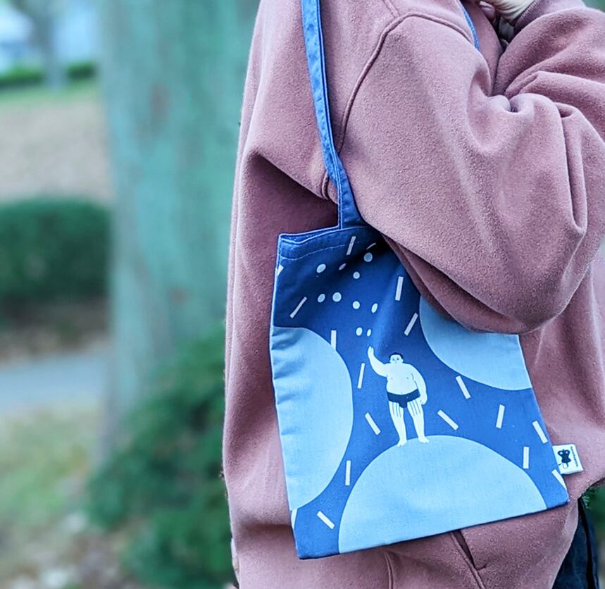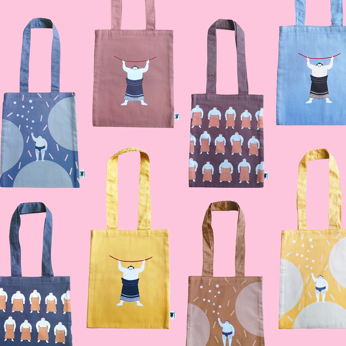 ちょっとしたおさんぽに持って行きたい、おすもうさん柄のミニサイズのトートバッグです♪